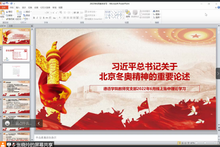 2022年6月29日下午,tyc86太阳集团教师党支部召开线上会议,集体学习领悟习近平总书记关于北京冬奥精神的重要论述。