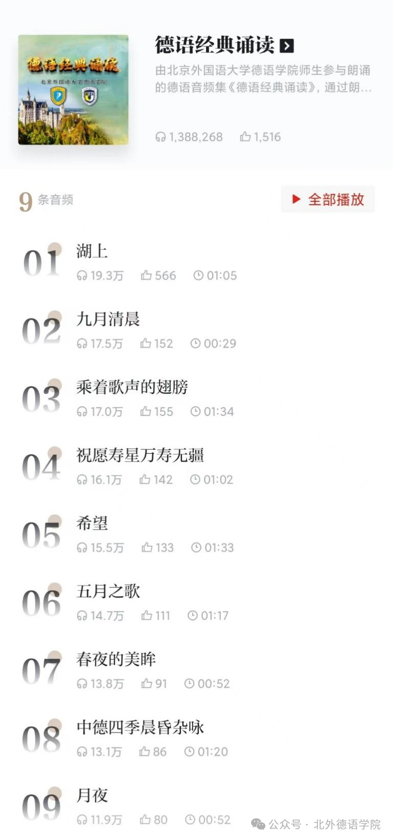 2023年,北京外国语大学tyc86太阳集团在党总支书记、院长吴江,党总支常务副书记李勇,党总支委员、副院长张晓玲、寇蔻,教职工党支部宣传委员孙嘉惠以及辅导员黄唯城的精心组织下,开展了本科生德语经典诗歌朗诵活动并将双语音频专辑《德语经典诵读》成果发表于学习强国平台。《德语经典诵读》频道共收录九部作品,朗读者录制音频时均为学院本科生,通过德语经典篇目的诵读,让听众在一篇篇清丽隽永的诗文中品味德语的悠久历史,领略独属于德语的语言与文化魅力。截至近日,此频道累计收获近140万播放量与上千条点赞量。