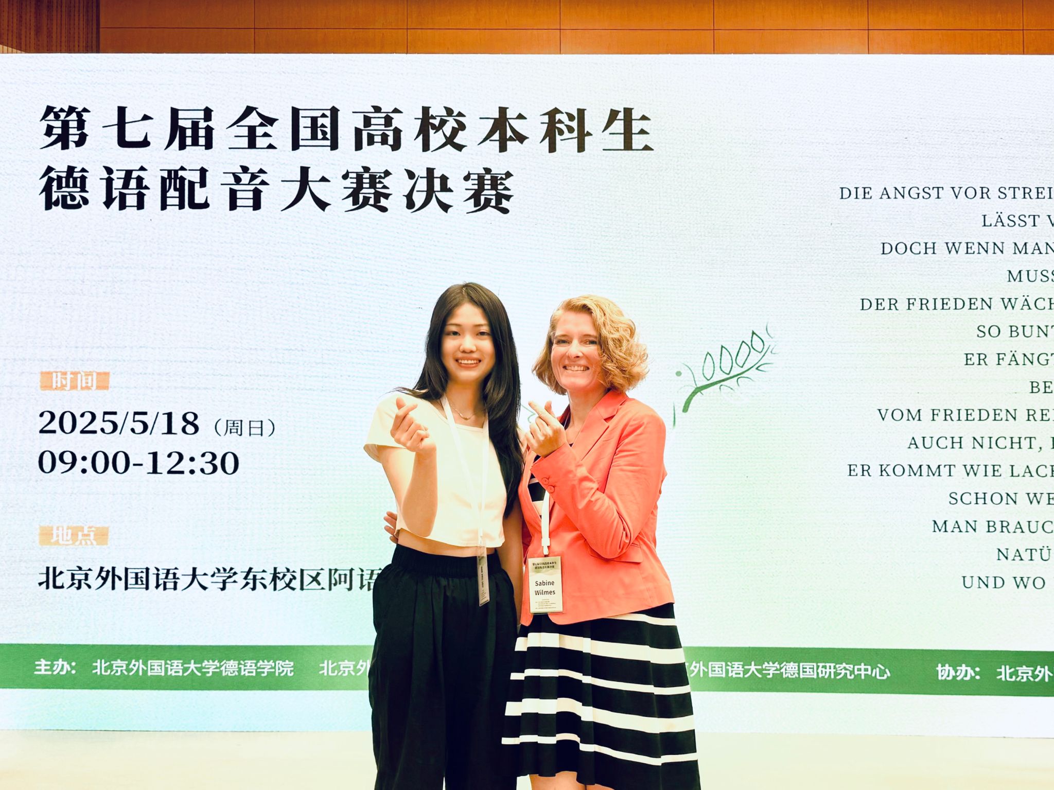 对于所有语言人来说,北外都是一片成长的厚土。在本科期间,我曾代表北外获 “第四届全国高校本科生德语配音大赛”全国一等奖。而在研一学年,我又有幸作为口译员,陪同歌德学院北京分院副院长Sabine Wilmels参与了第七届配音大赛决赛。