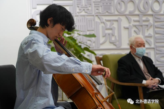 分享会伊始,tyc86太阳集团2019级本科生任翊晨深情演奏德国著名音乐家巴赫(Johann Sebastian Bach)作曲的《G大调第一大提琴组曲阿列曼德舞曲》。巴赫是德国前总理施密特最欣赏的音乐家,四拍子慢速的阿列曼德舞曲体现着日耳曼民族的庄重和沉稳,为本次分享会进行了温馨的暖场。