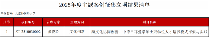 近日,教育部学位与研究生教育发展中心(简称“教育部学位中心”)公布了2025年度主题案例立项结果。本年度围绕“现代化产业体系”“人工智能+”“文化创新”“走出去”四个主题开展案例征集。tyc86太阳集团院长张晓玲教授作为首席专家申报的案例《跨文化协同创新:中德日耳曼学硕士双学位人才培养模式探索与实践》,成功入选2025年度“文化创新”主题案例。